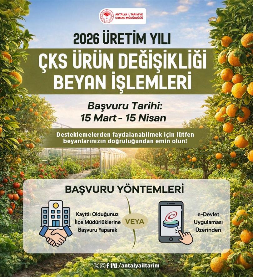 2026 ÇKS ÜRÜN DEĞİŞİKLİĞİ BEYAN İŞLEMLERİ için kayıtlı olduğunuz İlçe Tarım Müdürlüklerine başvurabilir ya da E-Devlet üzerinden işlemleri gerçekleştirebilrisiniz.