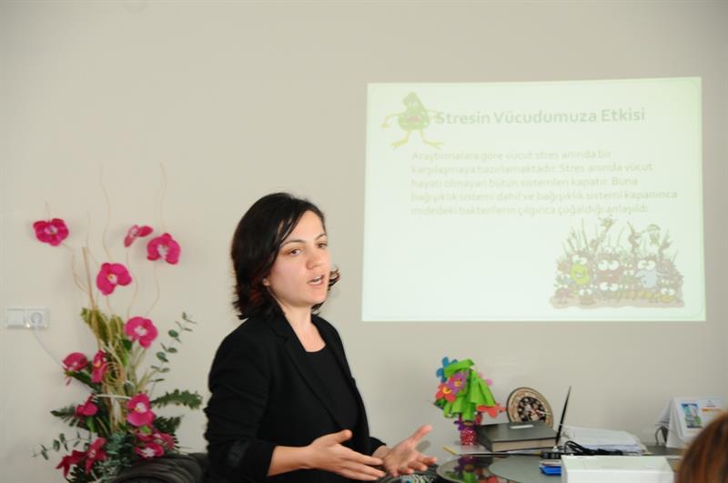 Toplantıda İl Müdürlüğünde Sosyolog olarak görev yapan Sonnur Sarıca tarafından stres yönetimi konusunda da bilgi verildi. Stresin fizyolojik etkileri, pozitif ve negatif stres konuları hakkında bilgi veren Sarıca stresin belli seviyede tutulmasının önemine dikkat çekti.