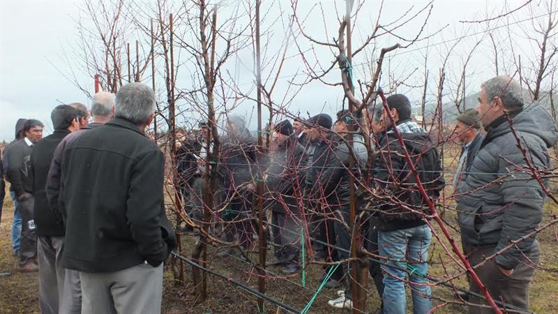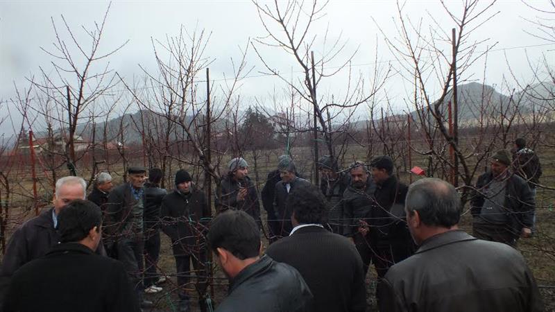 Eğitimde Ziraat Yüksek Müh.Sinan Butar şeftali çeşitleri ve yetiştiriciliği hakkında bilgi verdi. Ayrıca Şeftali ağaçlarında ince iğ şeklinde budama projesi ve diğer budama sistemleri ile ilgili bilgi vererek budama da dikkat edilmesi gereken hususlar uygulamalı olarak gösterildi.